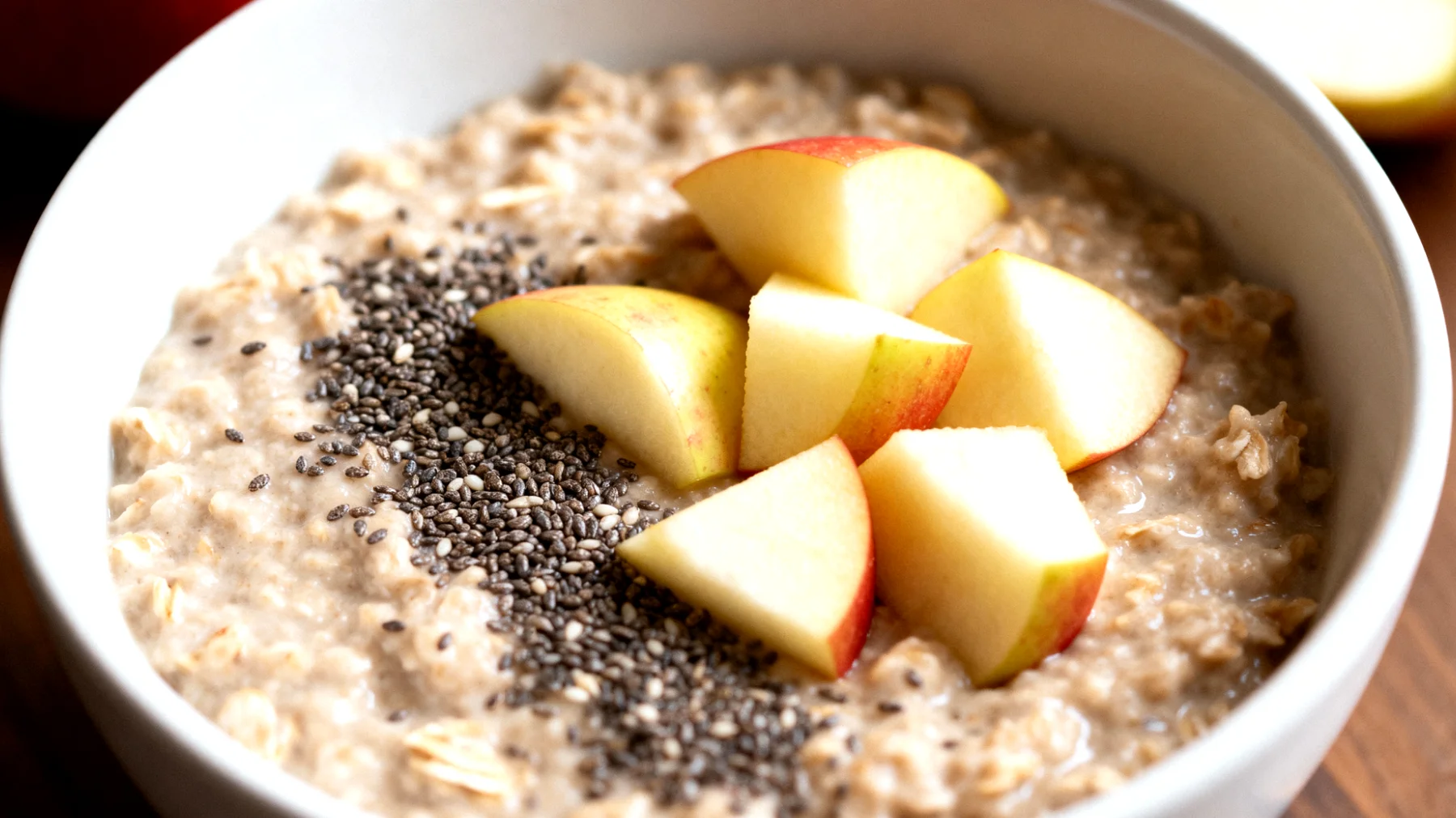 Esistono due strategie vincenti per integrare questo porridge nella routine. La prima è la versione overnight oats: la sera prima mescoli 40-50g di fiocchi d’avena con un cucchiaio di semi di chia, aggiungi latte vegetale o vaccino fino a coprire, chiudi in un barattolo e lasci in frigorifero. Al mattino trovi una crema pronta da arricchire con la mela tagliata a cubetti.